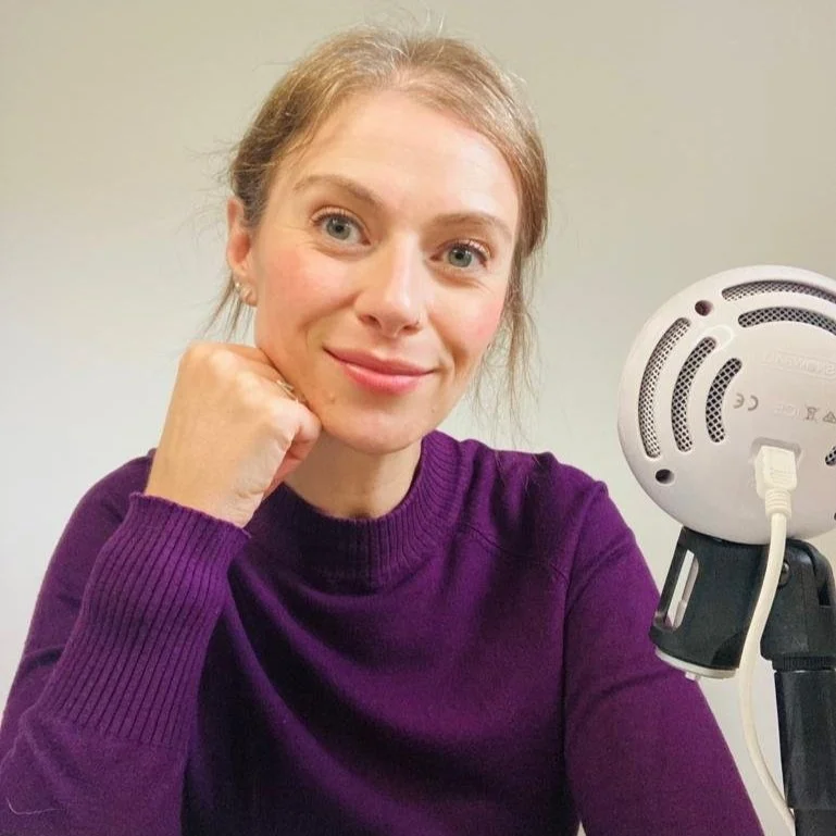 Smiling woman with brown hair and a purple jumper, beside a microphone. The background is neutral.